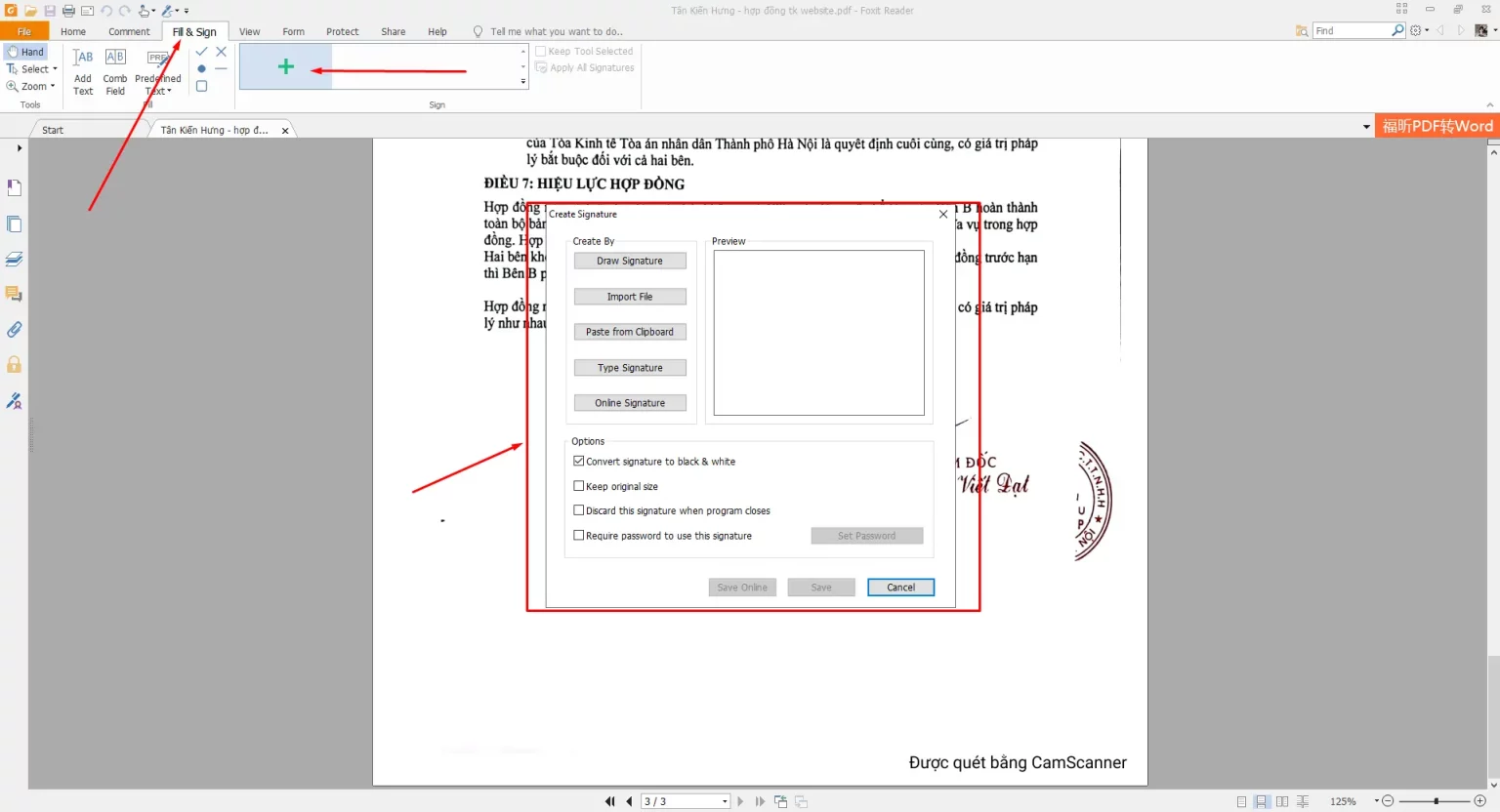 Bước 1: Sử dụng Foxit Reader để mở file PDF cần ký. Nhấn vào mục Home và chọn Fill & Sign; sau đó nhấn Create Signature.